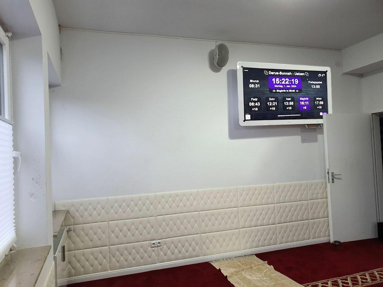 Between the athan and the iqama, and after each prayer, reminders and invocations are displayed. A Prophet's Hadith "May Allah's Prayer and Salvation Be to Him" is also displayed every 5 min