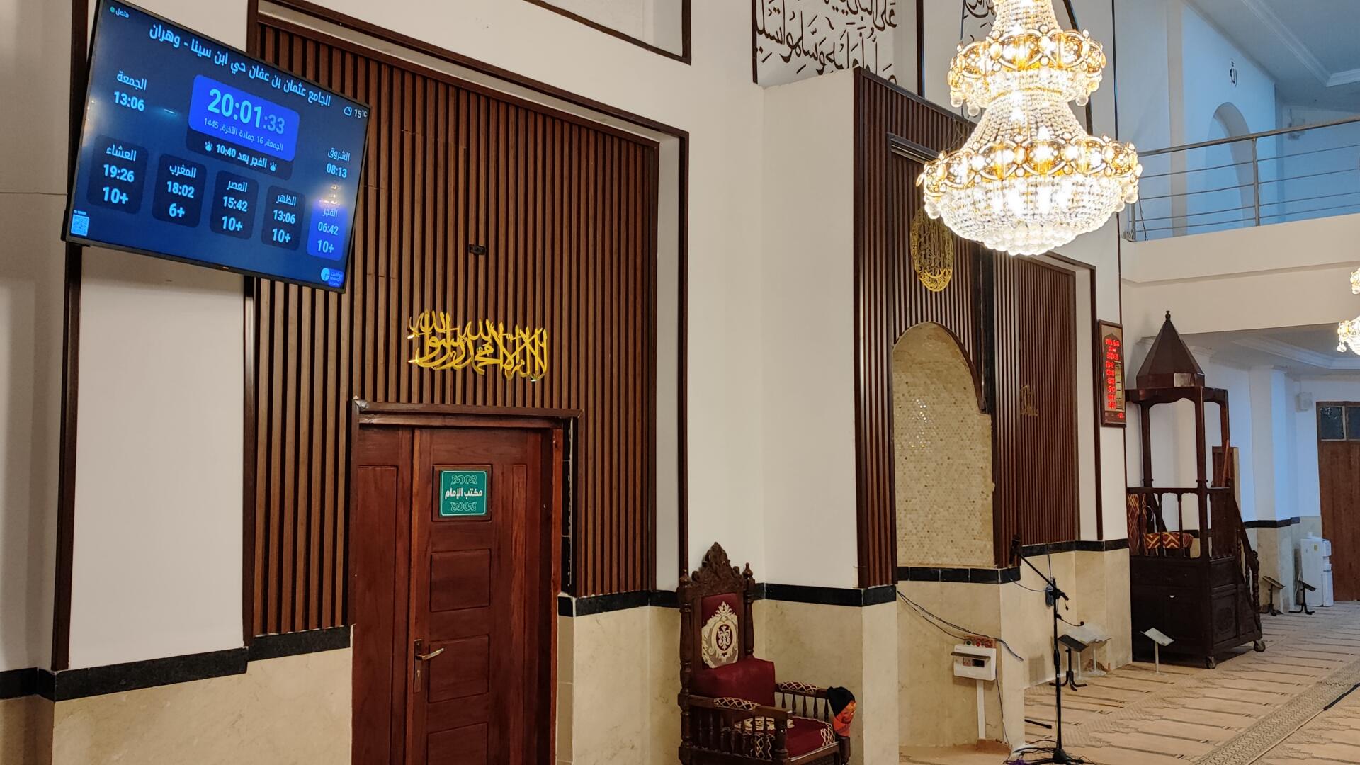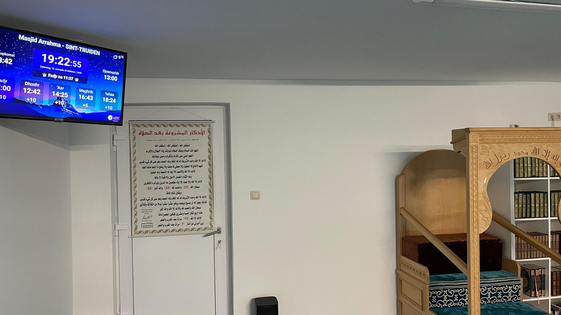 Between the athan and the iqama, and after each prayer, reminders and invocations are displayed. A Prophet's Hadith "May Allah's Prayer and Salvation Be to Him" is also displayed every 5 min