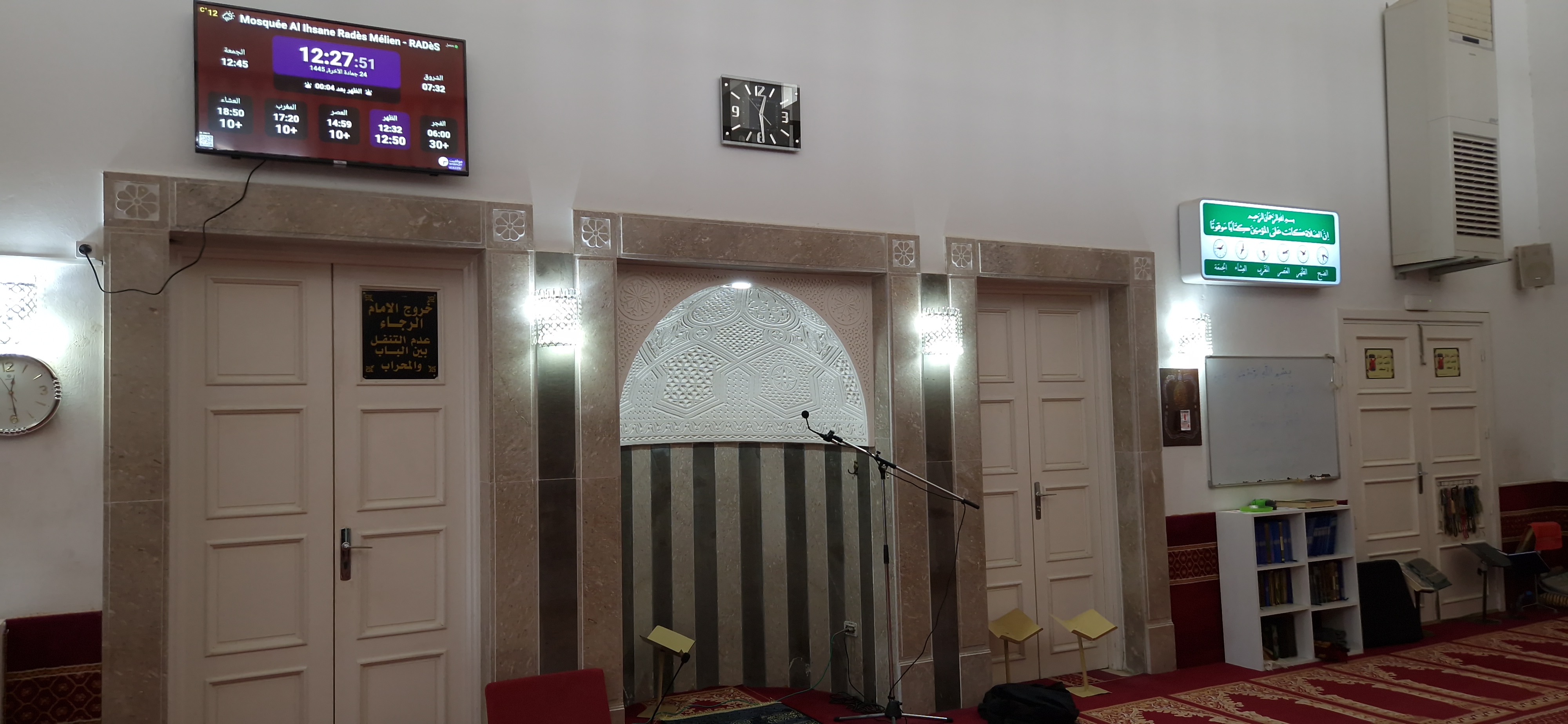 Between the athan and the iqama, and after each prayer, reminders and invocations are displayed. A Prophet's Hadith "May Allah's Prayer and Salvation Be to Him" is also displayed every 5 min