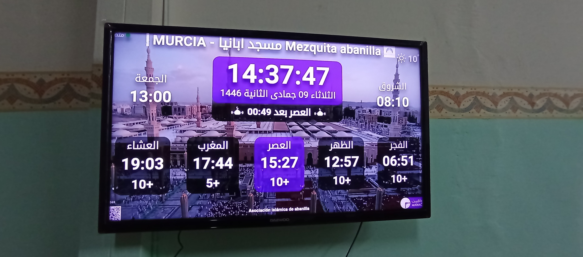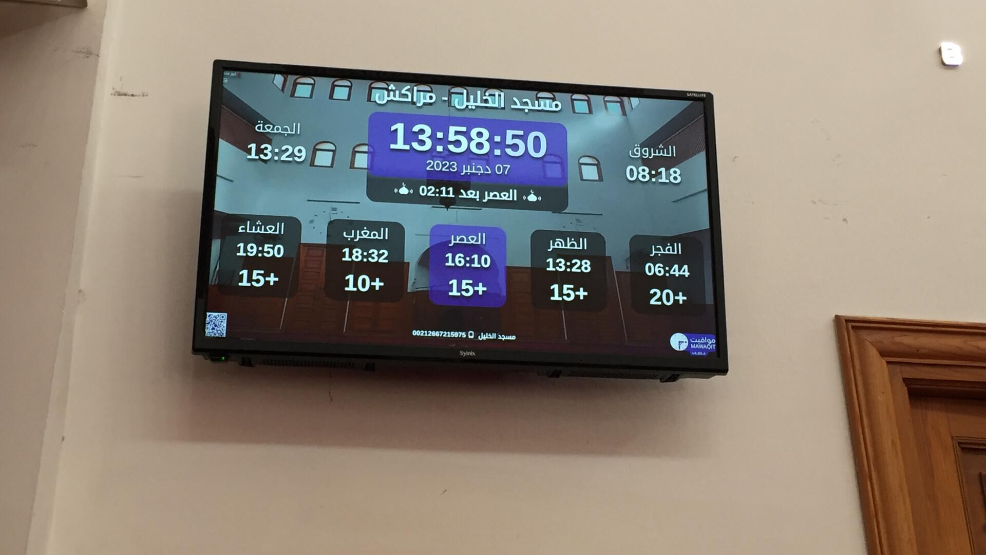 Between the athan and the iqama, and after each prayer, reminders and invocations are displayed. A Prophet's Hadith "May Allah's Prayer and Salvation Be to Him" is also displayed every 5 min