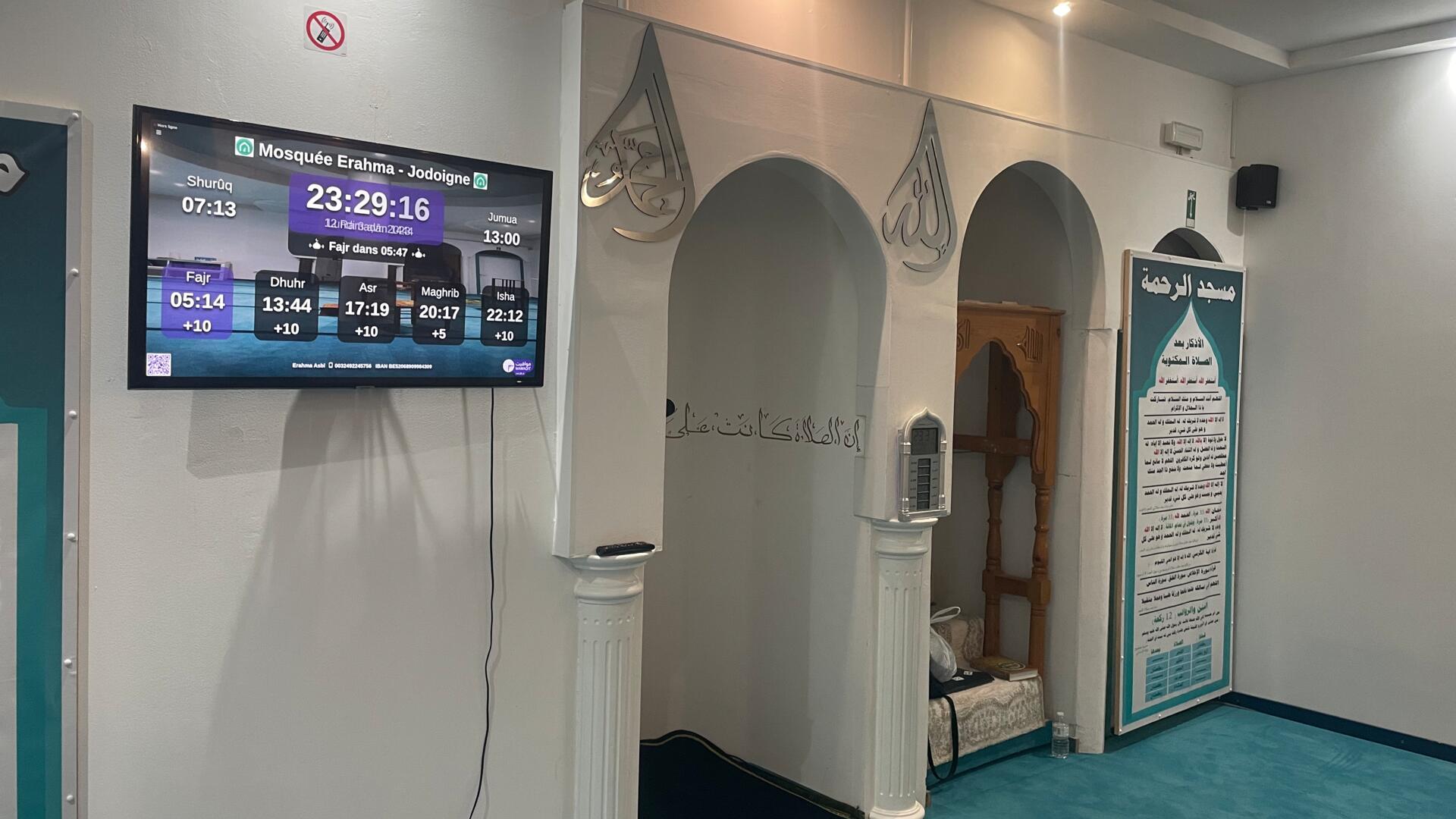 Between the athan and the iqama, and after each prayer, reminders and invocations are displayed. A Prophet's Hadith "May Allah's Prayer and Salvation Be to Him" is also displayed every 5 min