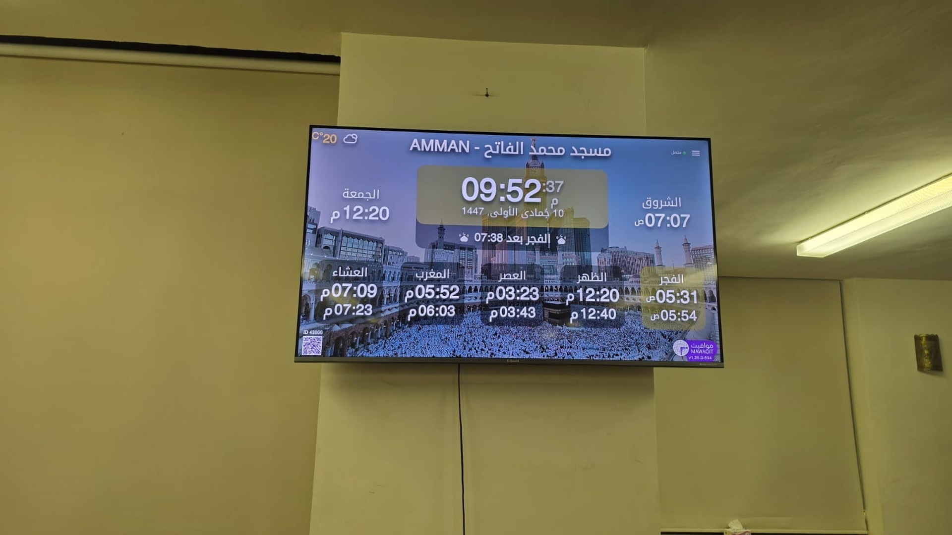 Entre l'adhan et iqama, et après chaque prière, des rappels et invocations sont affichés. Un hadith du prophète "que la prière d'Allah et son salut soient sur lui" est également affiché toutes les 5 min