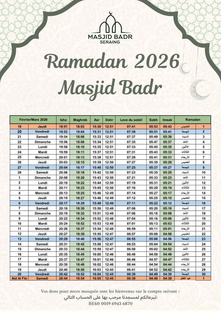 Ouverture automatique 15 minutes avant l'heure de prière et fermeture automatique 20 minutes après l'heure de la prière