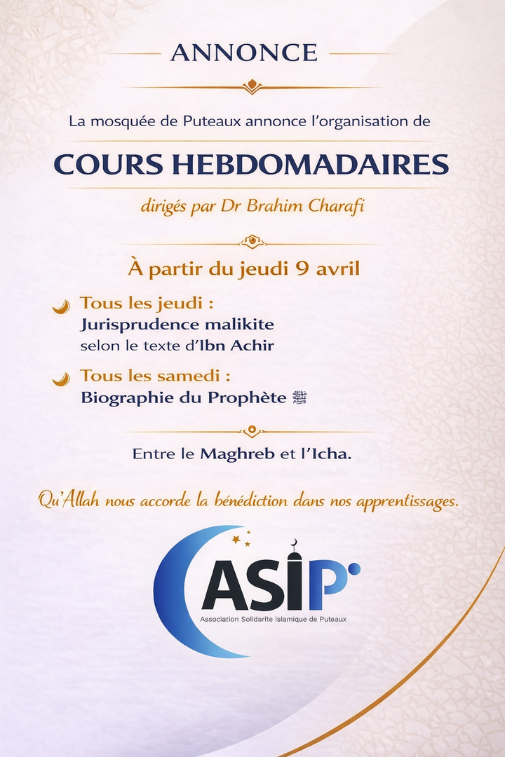 à partir du 8 avril, les horaires de Fajr et Isha changent à la mosquée de Puteaux (calcul à 15°). Merci de consulter les nouveaux horaires.