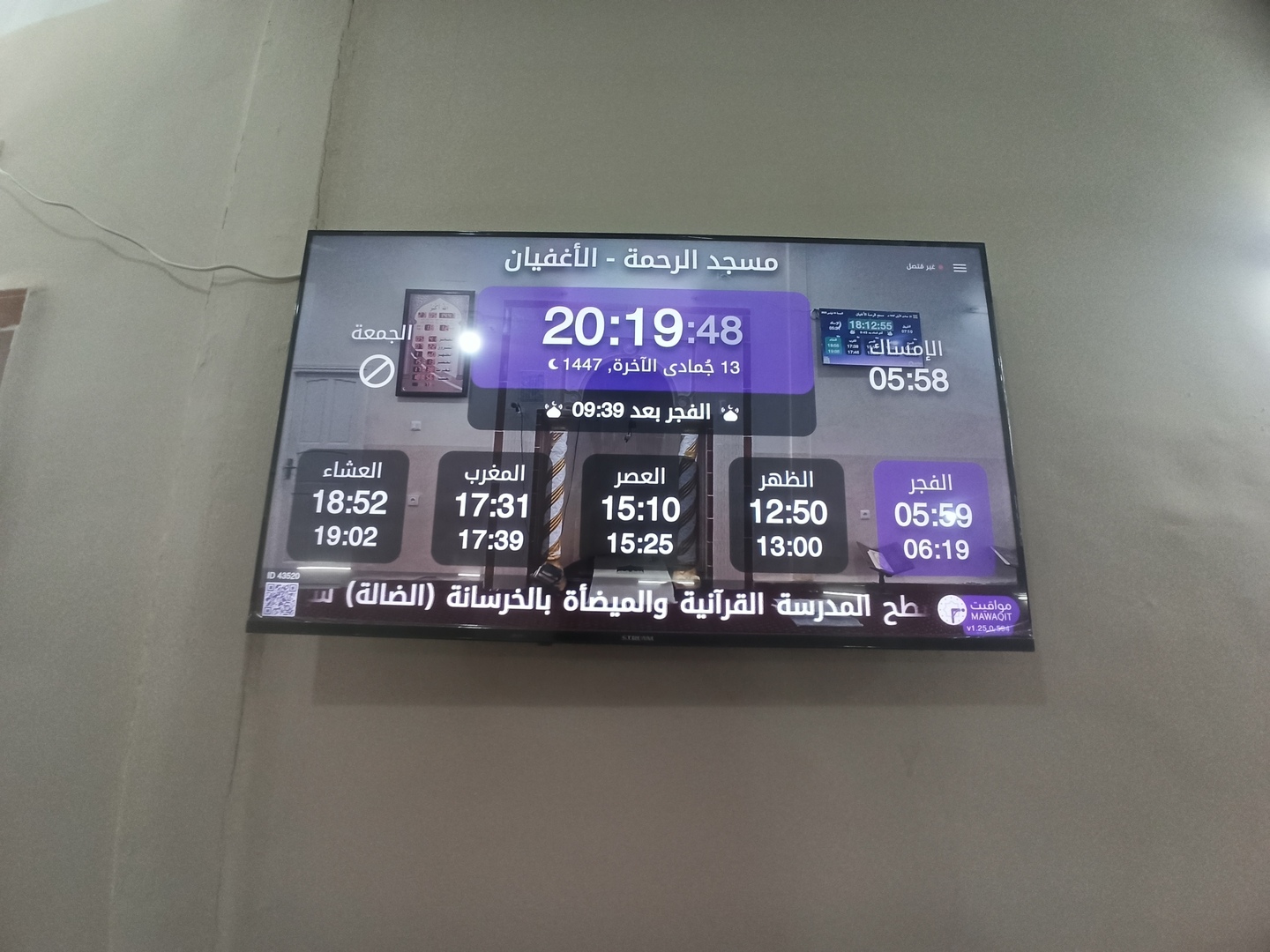 Between the athan and the iqama, and after each prayer, reminders and invocations are displayed. A Prophet's Hadith "May Allah's Prayer and Salvation Be to Him" is also displayed every 5 min