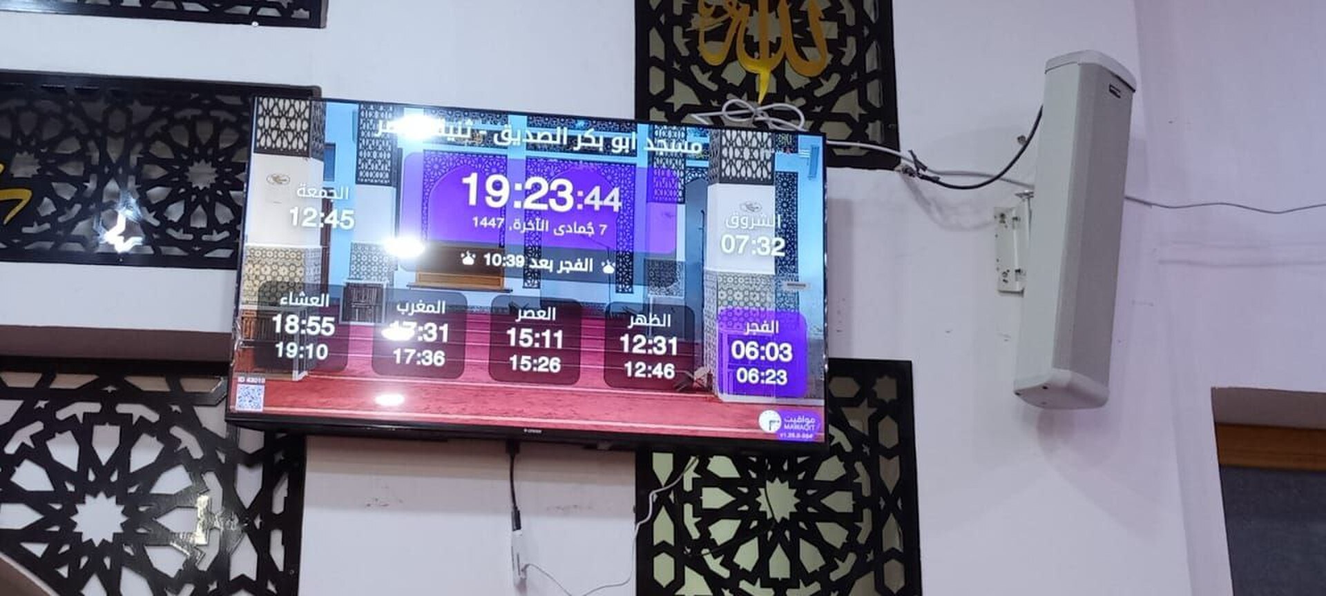 Between the athan and the iqama, and after each prayer, reminders and invocations are displayed. A Prophet's Hadith "May Allah's Prayer and Salvation Be to Him" is also displayed every 5 min