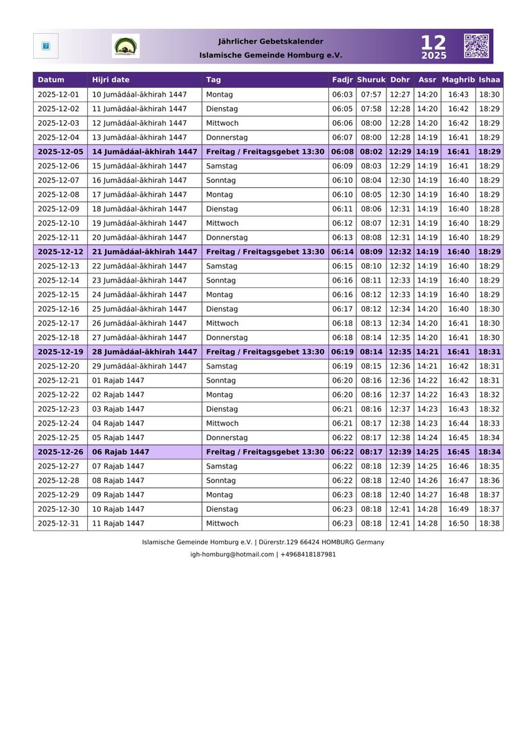 أوقات الصلاة ١٢/ ٢٠٢٥Gebetszeiten12/2025